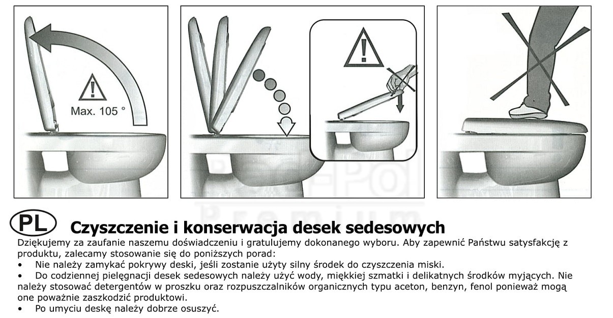 Użytkowanie i konserwacja deski sedesowej. Aby zapewnić długą żywotność, bezawaryjne działanie oraz higieniczne warunki użytkowania deski sedesowej, zalecamy przestrzeganie poniższych wskazówek: