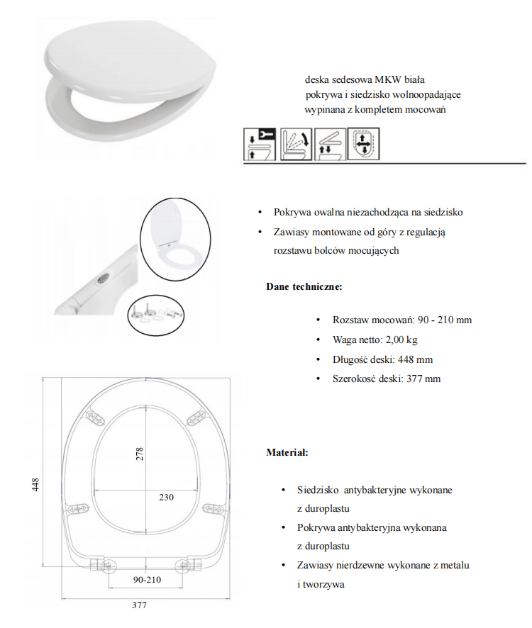 Deska sedesowa wolnoopadająca , deska wc , wykonana z duroplastu, dzięki zawartości cząstek srebra antybakteryjna. Do mycia deski nie należny używać środków chemicznych wystarczy czysta woda ewentualnie zwykłe mydło w płynie. Deska nie ulega odbarwieniu. Oferowana deska jest dokładnie dopasowana do Ceramiki. Zastosowane elastyczne odbojniki powodują że deska dokładnie dolega do misy dzięki czemu nie przesuwa się po porcelanie.
