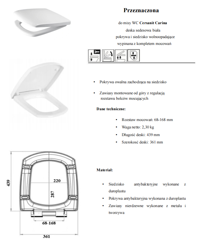 Deska wykonana z duroplastu, dzięki zawartości cząstek srebra antybakteryjna. Do mycia deski nie należny używać środków chemicznych wystarczy czysta woda ewentualnie zwykłe mydło w płynie. Deska nie ulega odbarwieniu. Oferowana deska jest dokładnie dopasowana do Ceramiki. Zastosowane elastyczne odbojniki powodują że deska dokładnie dolega do misy dzięki czemu nie przesuwa się po porcelanie.