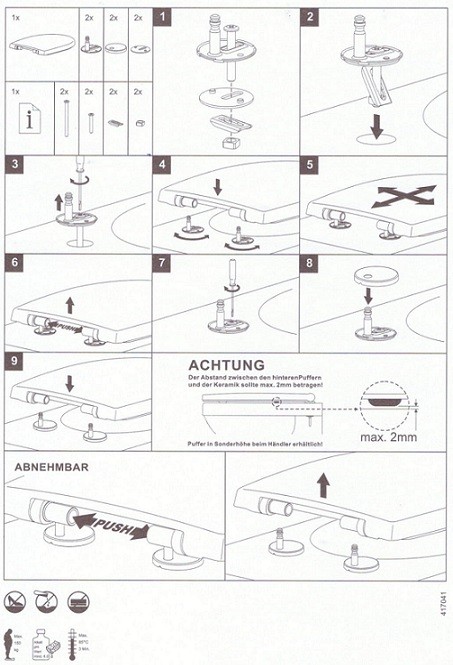 - Komfort – amortyzatory zamontowane przy obu zawiasach deski umożliwiają szybkie wypinanie na zasadzie zatrzasku oraz powodują wolne opadanie tak pokrywy jak i siedziska.