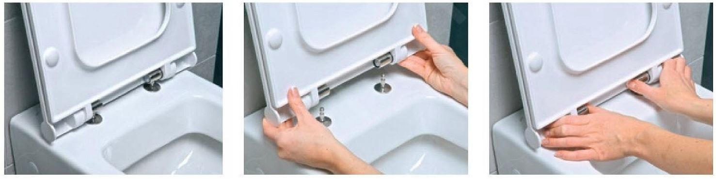 - Komfort – amortyzatory zamontowane przy obu zawiasach deski umożliwiają szybkie wypinanie na zasadzie zatrzasku oraz powodują wolne opadanie tak pokrywy jak i siedziska.